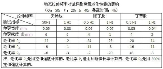 一般試驗(yàn)選用的動態(tài)拉伸頻率,是以接近制品的實(shí)際使用狀態(tài),要求既加速老化而又不導(dǎo)致試樣發(fā)生機(jī)械疲勞龜裂為原則。如果采用的頻率過小,則起不到加速老化的效果,如果采用的頻率過大,則會使試樣疲勞龜裂取代臭氧龜裂,導(dǎo)致錯(cuò)誤的試驗(yàn)結(jié)果。大多數(shù)發(fā)達(dá)國家關(guān)與臭氧老化試驗(yàn)箱的標(biāo)準(zhǔn)如BS、NF、ASTM,以及ISO等都采用相同的動態(tài)頻率進(jìn)行試驗(yàn),即規(guī)定頻率為0.5Hz。但也有少數(shù)規(guī)定或設(shè)計(jì)的頻率為每分鐘拉伸10次,15次或60次。比較不同動態(tài)頻率的試驗(yàn),結(jié)果是有差異的,如下表所示。為靠攏國際標(biāo)準(zhǔn),故臭氧老化試驗(yàn)箱GB/T13642-1992標(biāo)準(zhǔn)規(guī)定試驗(yàn)的動態(tài)拉伸頻率,也采用0.5Hz,即每分鐘拉伸30次。